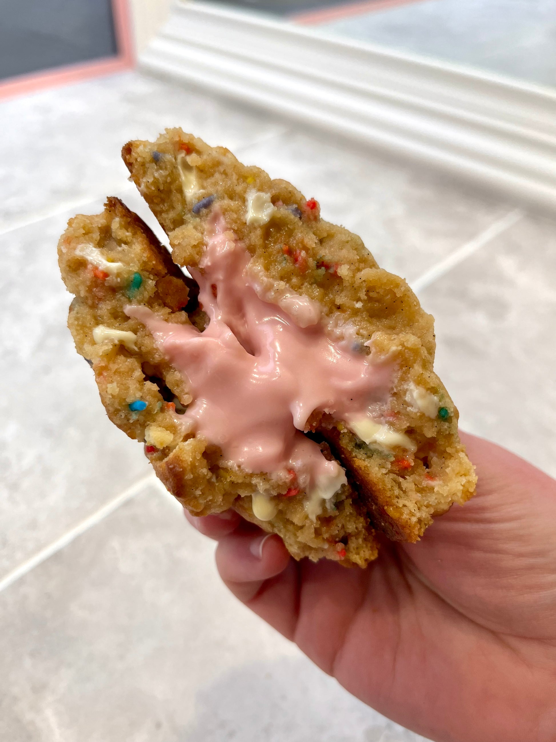 Chunky nyc style cookies filled sprinkles and Belgian white chocolate chips, and a pink white chocolate center.