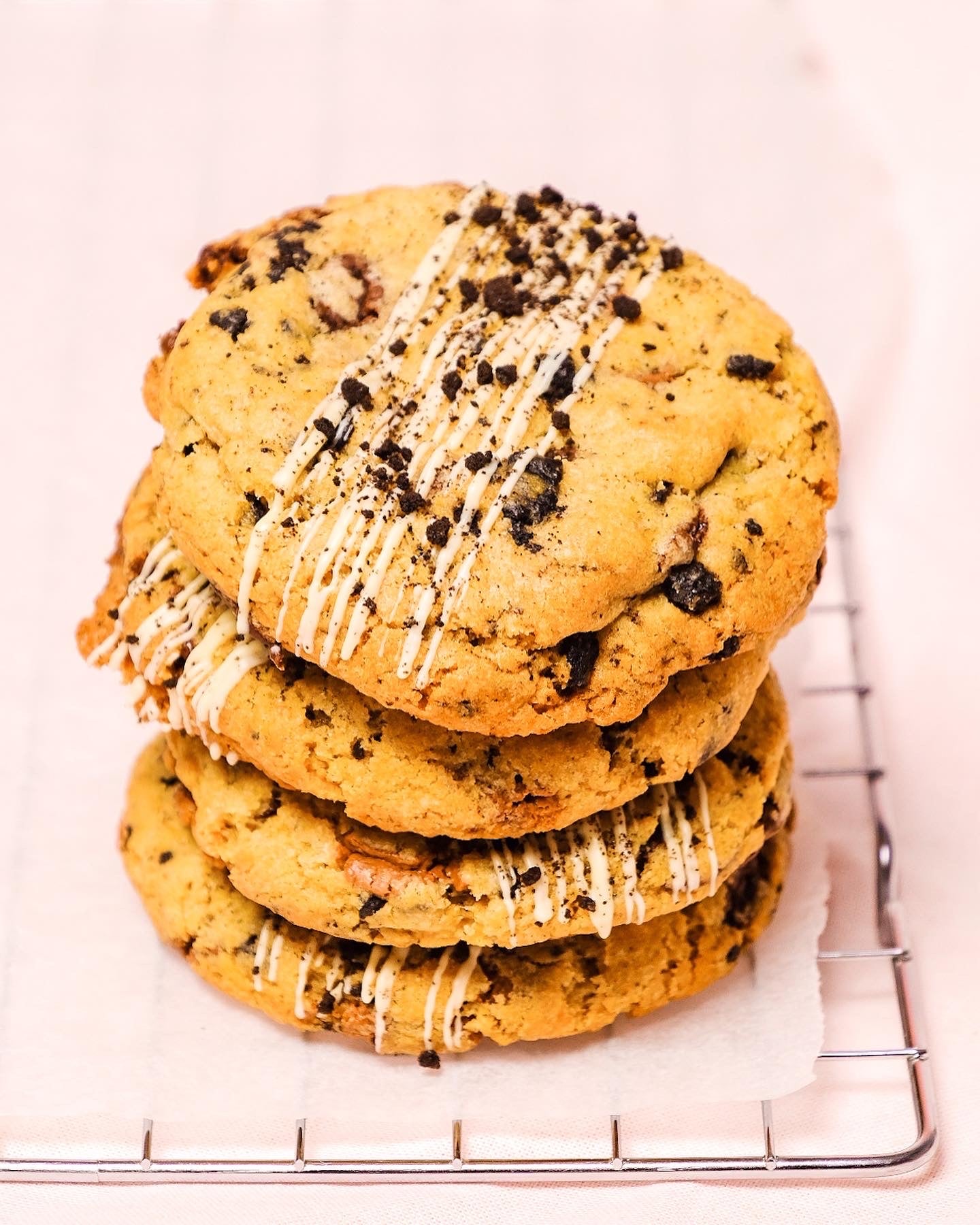 Chunky nyc style cookies filled Oreo pieces and Belgian milk and dark chocolate chips, and a cookies and cream center.
